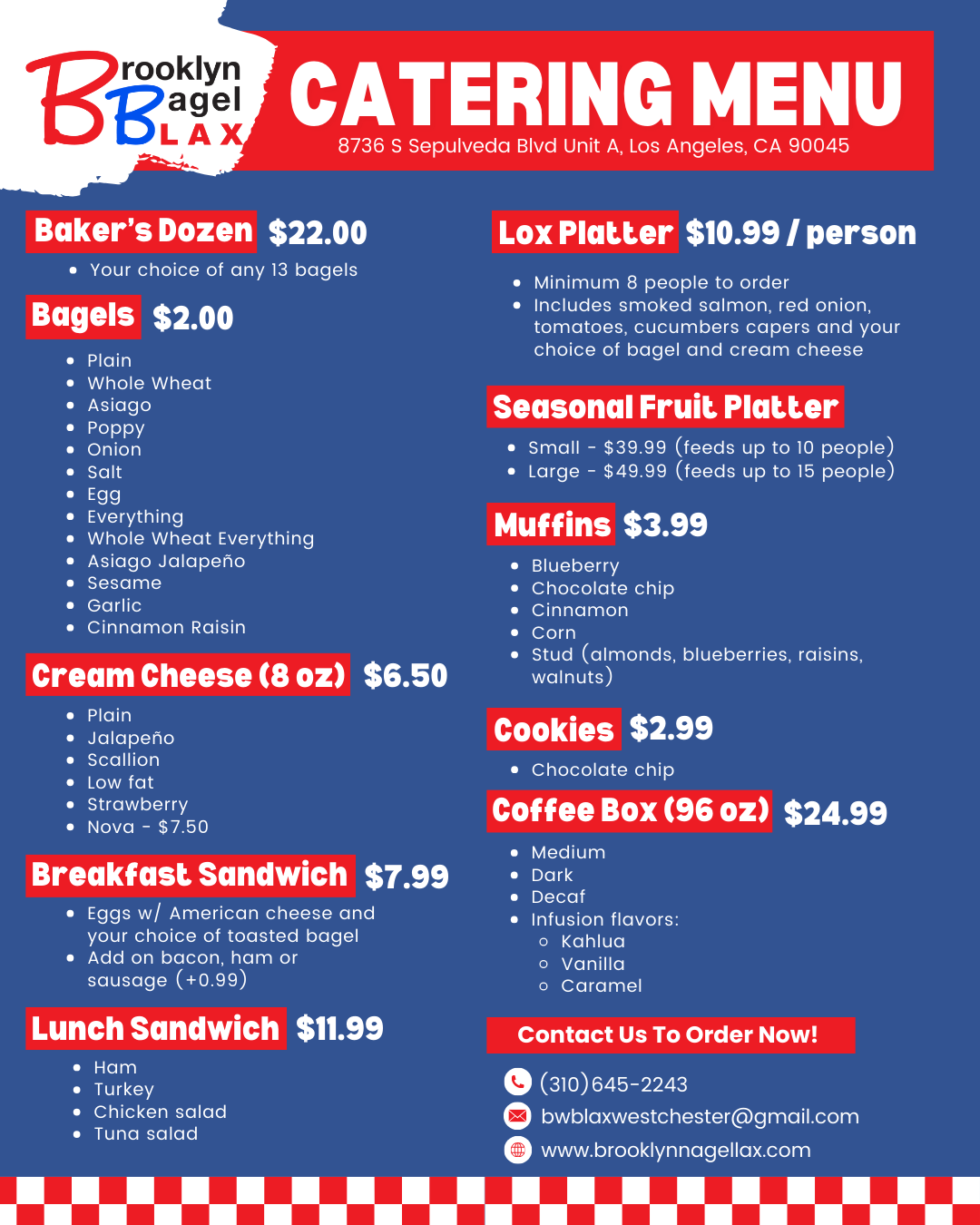Call us at (310) 645-2243 or email us at info@brooklynbagellax.com for more information